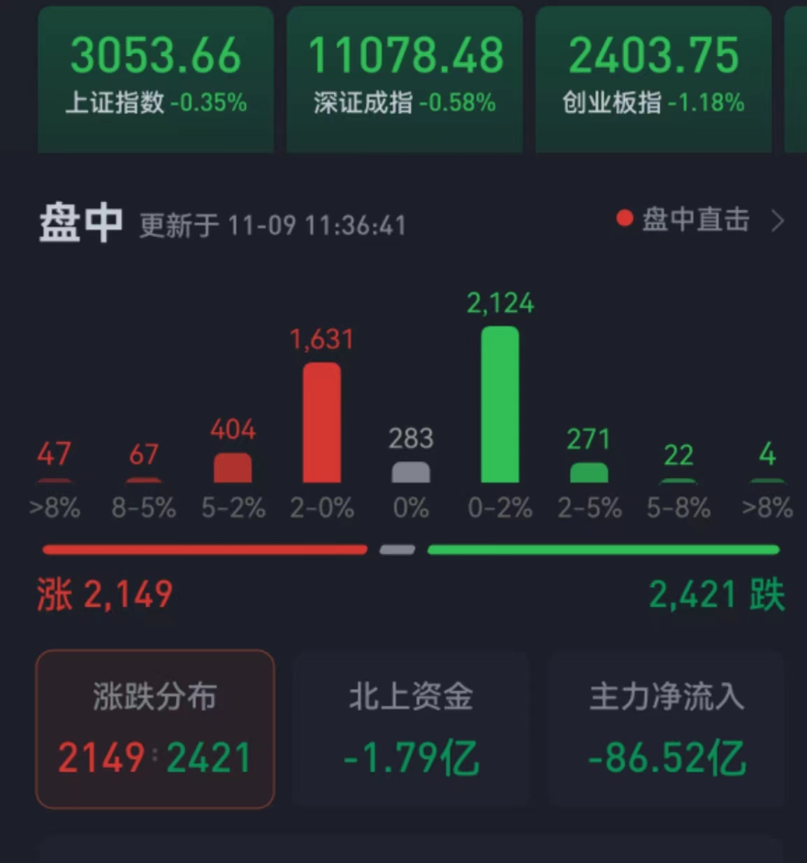 周三(11月9日),三大股指震蕩調(diào)整。截至上午收盤,上證指數(shù)跌幅達(dá)0.35%,報(bào)3053.66點(diǎn);深證成指和創(chuàng)業(yè)板指跌幅分別為0.58%和1.18%;滬深兩市合計(jì)成交額4870.64億元,總體來看,兩市個(gè)股跌多漲少。