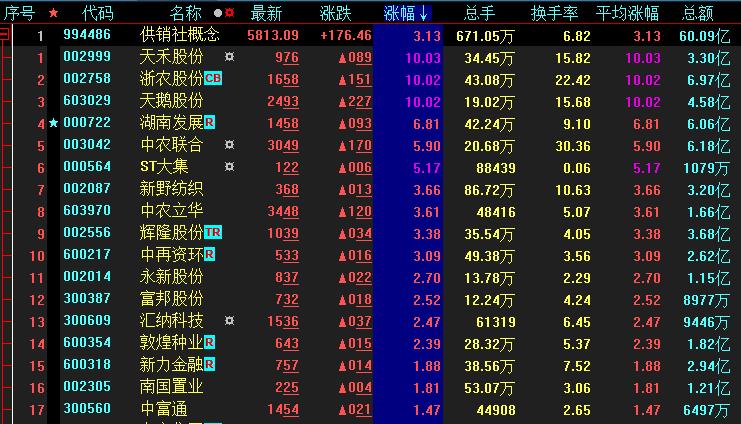 具體看,截至11月9日上午收盤,供銷社概念板塊重回升勢,漲幅居首,達(dá)3.13%。其中,天禾股份、浙農(nóng)股份、天鵝股份和ST大集等4只概念股聯(lián)袂漲停。