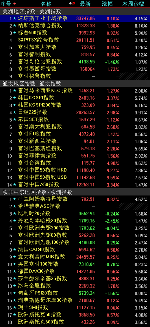 平安證券表示,全球股市明顯回暖,美成長股領(lǐng)跑全球。美股三大指數(shù)本周均明顯反彈。11月10日美國CPI數(shù)據(jù)公布后,超預(yù)期回落的10月CPI同比數(shù)據(jù)使得市場加息預(yù)期回落,風險偏好大幅升溫,納指當日漲幅便達到7%以上,創(chuàng)下2020年4月以來最大單日漲幅。歐股同樣受到美國通脹降溫帶動的風險偏好回升影響,多數(shù)股指延續(xù)了上周的上漲趨勢。