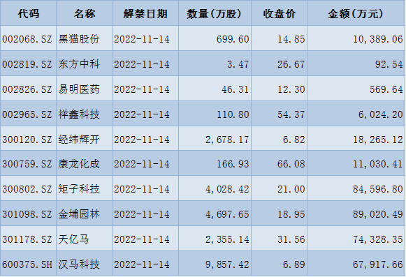 表:下周解禁市值前十位(本周收盤價計算)