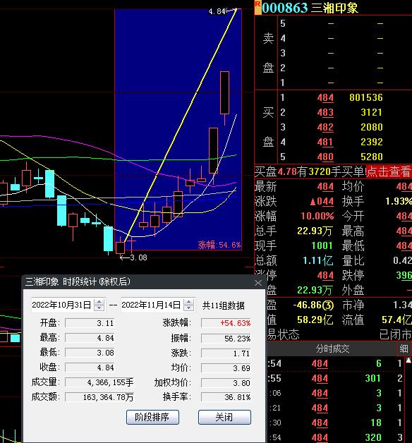 11月14日,熱門股三湘印象再度漲停,截至收盤,報(bào)4.84元,連續(xù)11個(gè)交易日上漲,累計(jì)漲幅達(dá)54.63%。