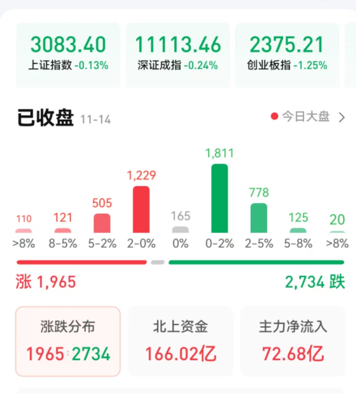 周一(11月14日),A股三大指數(shù)震蕩回落。截至收盤,上證指數(shù)跌幅達(dá)0.13%報(bào)3083.4點(diǎn),深證成指跌幅達(dá)0.24%報(bào)11113.46點(diǎn),創(chuàng)業(yè)板指跌幅達(dá)1.25%報(bào)2375.21點(diǎn),上證50指數(shù)逆市漲0.8%;兩市合計(jì)成交10673億元,北向資金凈買入166.02億元。總體來看,兩市個(gè)股跌多漲少。