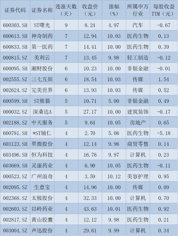 表:連續(xù)上漲4天且今日收盤漲停股一覽