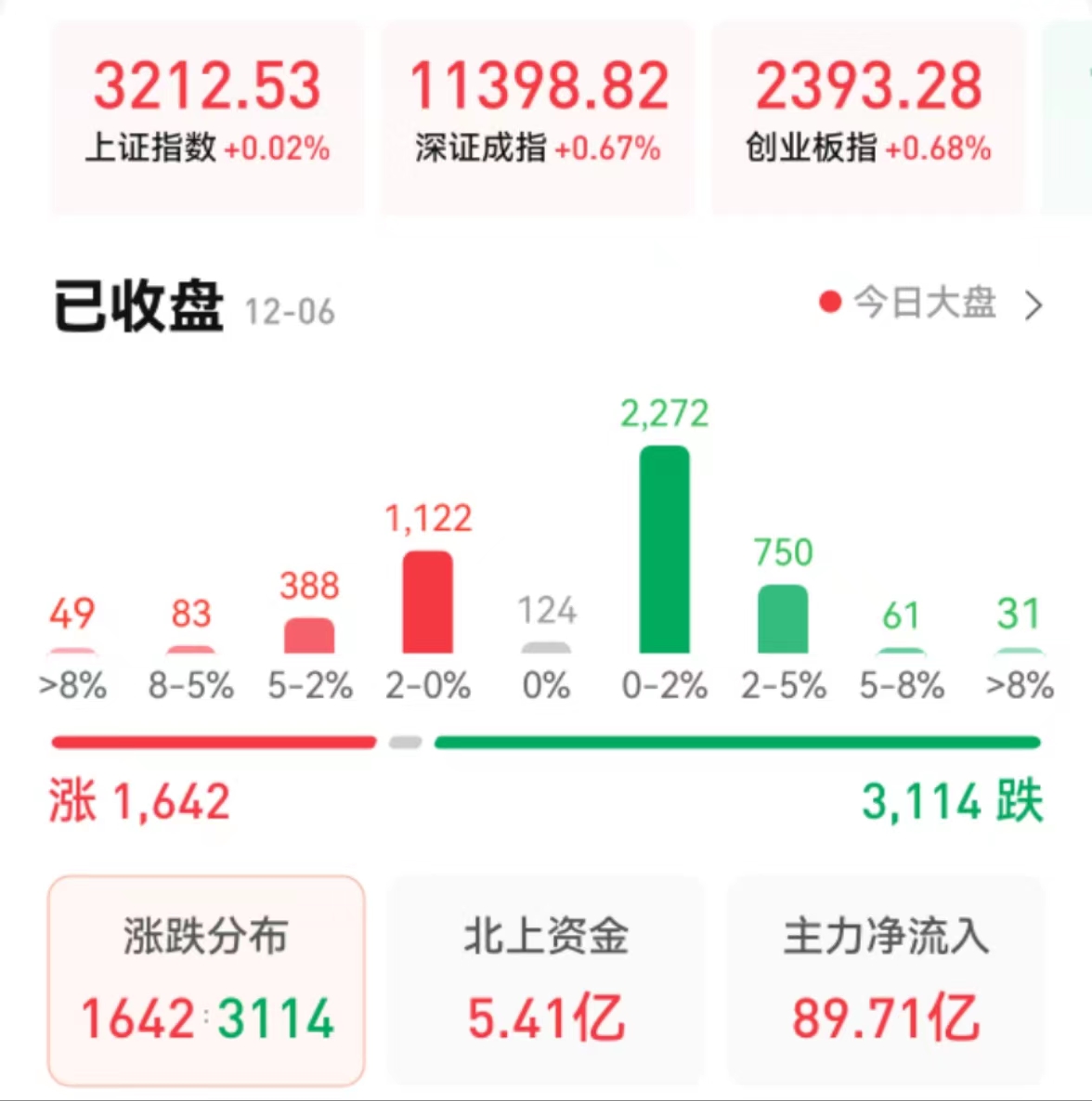 12月6日,A股三大指數(shù)震蕩攀升,全線飄紅。截至收盤,上證指數(shù)微漲0.02%報3212.53點,深證成指漲0.67%報11398.82點,創(chuàng)業(yè)板指漲0.68%報2393.28點;兩市合計成交額接近萬億元,達(dá)9982億元,北向資金凈買入5.41億元??傮w上看,市場交投熱度略有減少,下跌個股超3000只。
