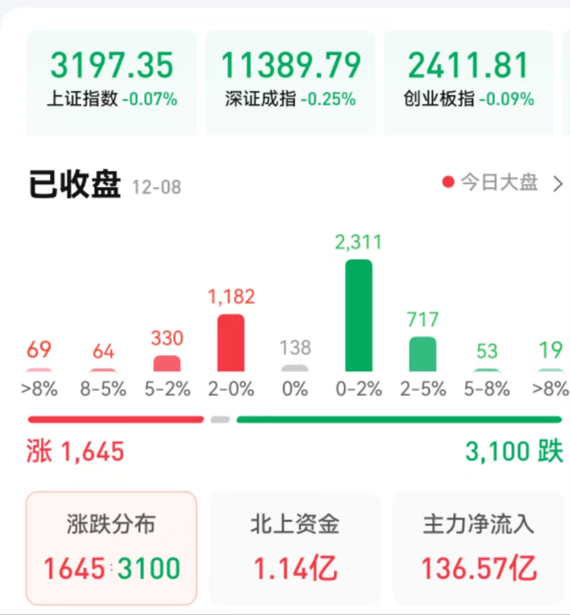 12月8日,A股三大指數(shù)震蕩回落。截至收盤,上證指數(shù)微跌0.07%報3197.35點(diǎn),3200點(diǎn)得而復(fù)失;深證成指跌0.25%報11389.79點(diǎn),創(chuàng)業(yè)板指跌0.09%報2411.81點(diǎn),兩市合計成交額8698億元,北向資金凈買入1.14億元??傮w上看,A股個股跌多漲少,超3000只個股出現(xiàn)下跌,市場交投熱度繼續(xù)降低。