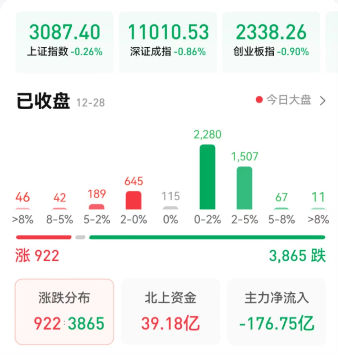 周三(12月28日),A股三大指數(shù)繼續(xù)震蕩,小幅下跌。截至收盤,上證指數(shù)跌0.26%報3087.4點(diǎn),深證成指跌0.86%報11010.53點(diǎn),創(chuàng)業(yè)板指跌0.90%報2338.26點(diǎn);兩市合計成交6508億元,北向資金凈買入39.18億元。總體上看,A股個股跌多漲少,近3900只個股下跌。其中,漲停個股達(dá)40只,跌停個股達(dá)14只。