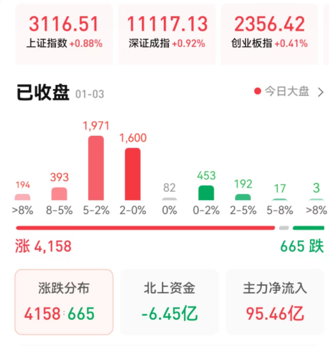 周二(1月3日),A股三大指數(shù)震蕩走強(qiáng)。截至收盤,上證指數(shù)漲0.88%報(bào)3116.51點(diǎn),深證成指漲0.92%報(bào)11117.13點(diǎn),創(chuàng)業(yè)板指微漲0.41%報(bào)2356.42點(diǎn),兩市合計(jì)成交7888億元,北向資金凈賣出6.45億元??傮w上看,A股個(gè)股漲多跌少,上漲個(gè)股超4000只。值得關(guān)注的是,今日漲停個(gè)股逾百只,達(dá)116只,跌停個(gè)股有3只。