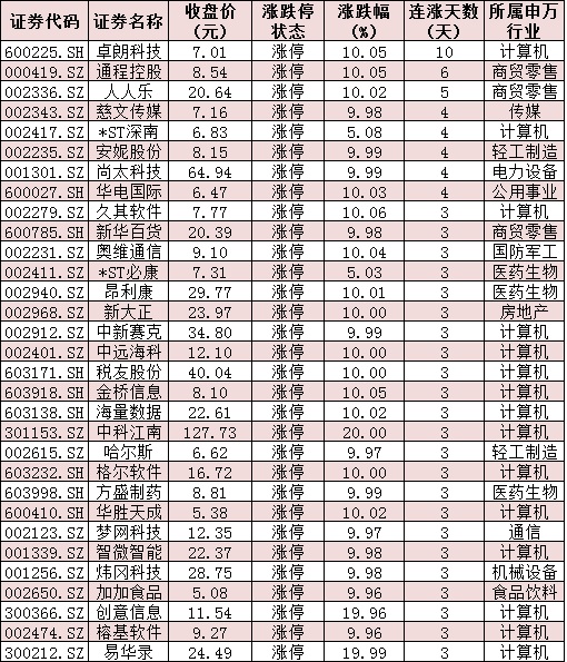 表:連續(xù)上漲3日且今日收盤漲停個(gè)股情況: