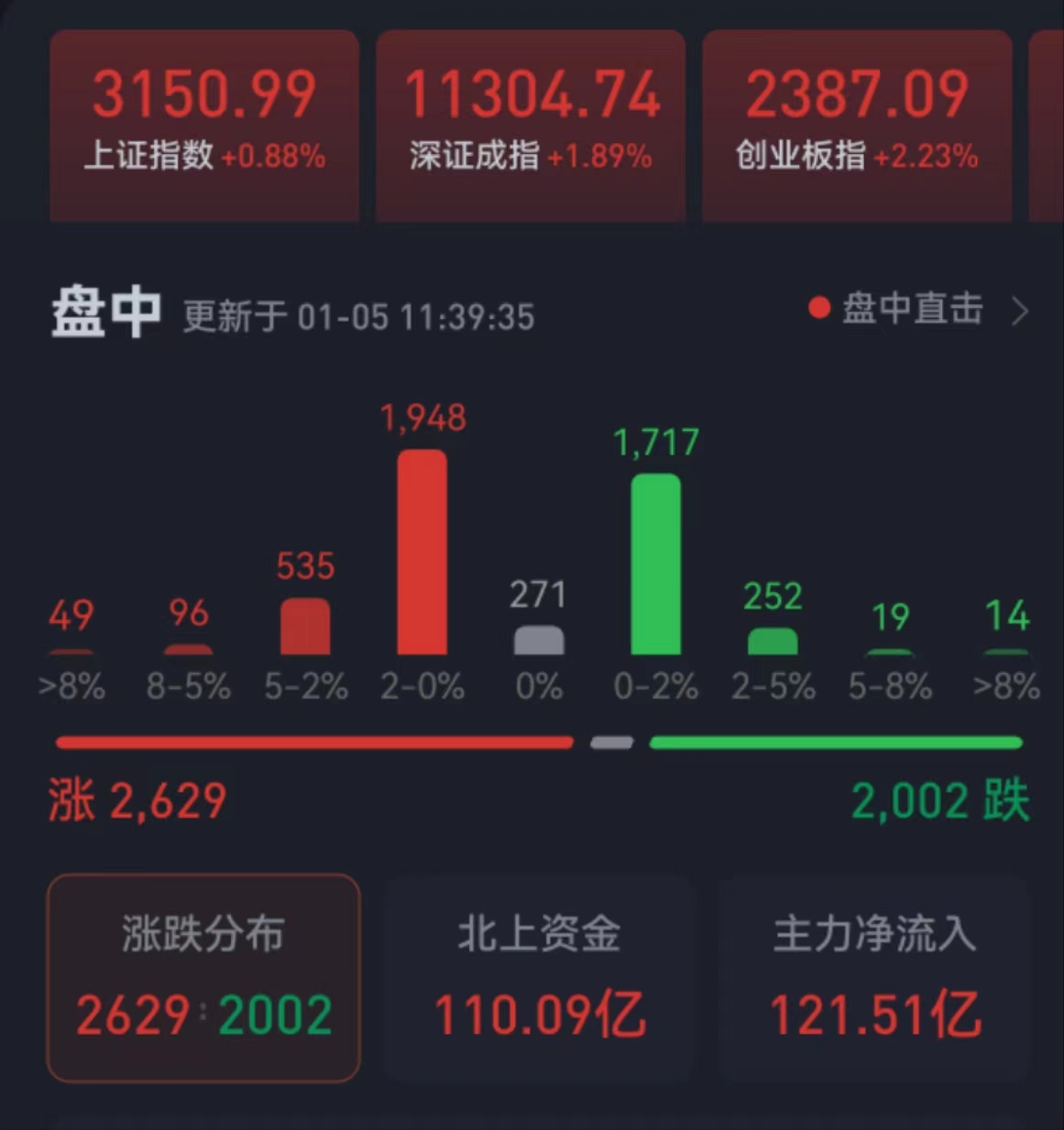 周四(1月5日),三大股指繼續(xù)震蕩走強(qiáng),全線飄紅。截至上午收盤(pán),上證指數(shù)漲幅達(dá)0.88%,報(bào)3150.99點(diǎn);深證成指和創(chuàng)業(yè)板指漲幅分別為1.89%和2.23%;滬深兩市合計(jì)成交額5373.4億元,總體來(lái)看,兩市個(gè)股漲多跌少,上漲個(gè)股超2600只,其中,漲停個(gè)股達(dá)40只,跌停個(gè)股達(dá)8只。