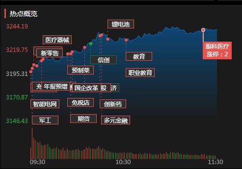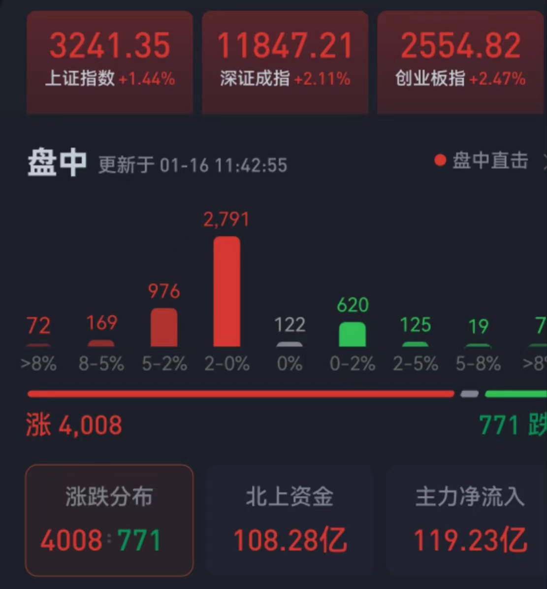 周一(1月16日),三大股指繼續(xù)震蕩走強(qiáng),全線飄紅。截至上午收盤,上證指數(shù)漲幅達(dá)1.44%,報3241.35點;深證成指和創(chuàng)業(yè)板指漲幅分別為2.11%和2.47%;滬深兩市合計成交額5795.4億元??傮w來看,兩市個股漲多跌少,上漲個股近超4000只,其中,漲停個股達(dá)45只,跌停個股達(dá)5只。