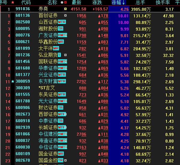 具體看,截至1月16日上午收盤,券商板塊表現(xiàn)搶眼,漲幅達(dá)4.26%。其中,首創(chuàng)證券、山西證券、湘財股份等券商股紛紛漲停。