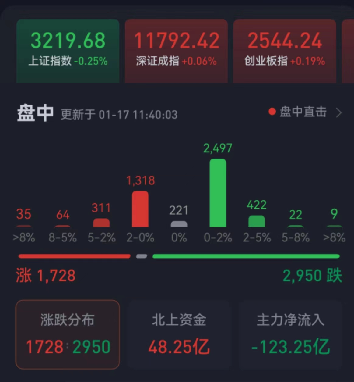 周二(1月17日),三大股指震蕩分化,漲跌不一。截至上午收盤,上證指數(shù)跌幅達(dá)0.25%,報(bào)3219.68點(diǎn);深證成指和創(chuàng)業(yè)板指漲幅分別為0.06%和0.19%;滬深兩市合計(jì)成交額4458.1億元,總體來看,兩市個(gè)股跌多漲少,其中,漲停個(gè)股達(dá)24只,跌停個(gè)股達(dá)5只。