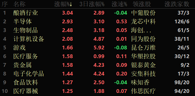 東方財(cái)富行業(yè)方面,截至2月2日11:30,86類(lèi)行業(yè)中59類(lèi)上漲,占比68.60%,其中,釀酒行業(yè)漲幅居首,達(dá)3.04%;此外,半導(dǎo)體、生物制品、計(jì)算機(jī)設(shè)備等行業(yè)漲幅也超過(guò)2%。下跌方面,教育行業(yè)跌幅居首,達(dá)2.23%;此外,航天航空和多元金融跌幅也均超1%。
