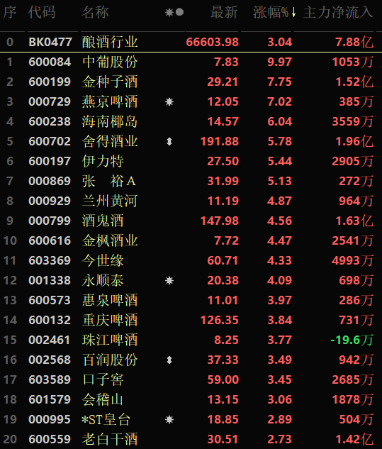 從早盤(pán)表現(xiàn)強(qiáng)勢(shì)的釀酒行業(yè)看,交易中的40只成份股有37只上漲,其中,中葡股份封漲停板,另有6只個(gè)股漲超5%。資金流向看,該行業(yè)大單資金凈流入額為7.88億元,居行業(yè)第2位。