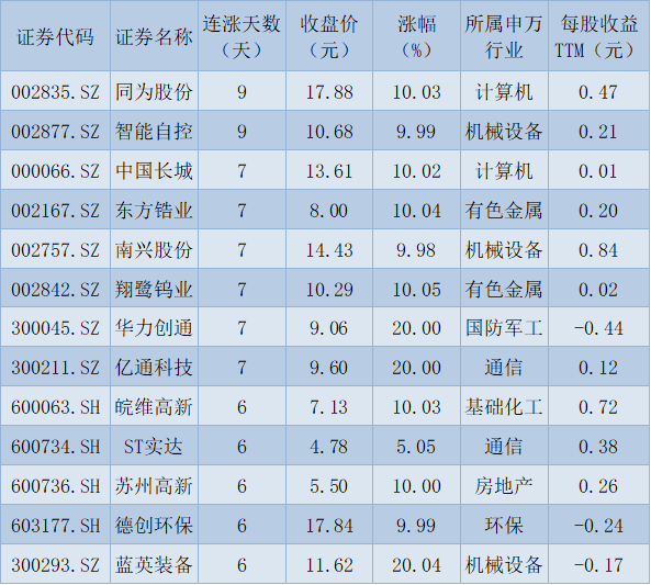 表:連續(xù)上漲6日且今日收盤漲停股一覽