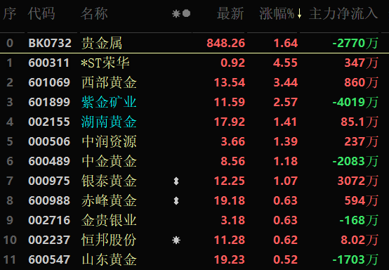 從早盤表現(xiàn)相對強(qiáng)勢的貴金屬行業(yè)看,交易中的11只成份股全線上漲。資金方面,有2770萬元大單資金凈流出貴金屬行業(yè)。
