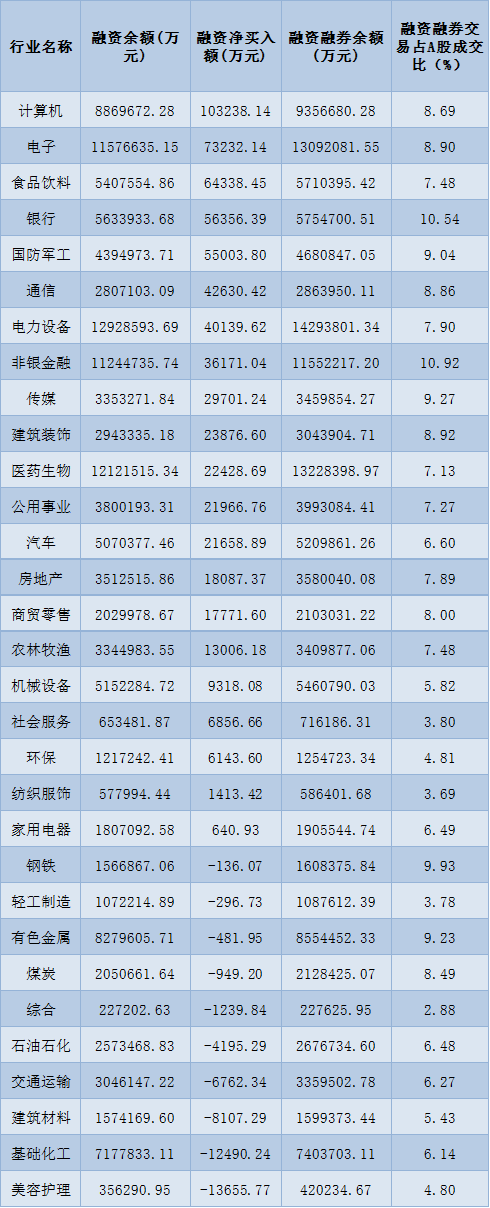 表:2月13日申萬一級行業(yè)兩融交易情況: