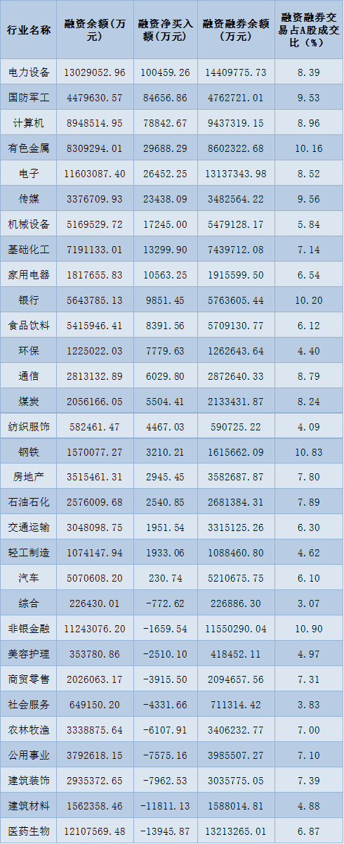 表:2月14日申萬一級行業(yè)兩融交易情況: