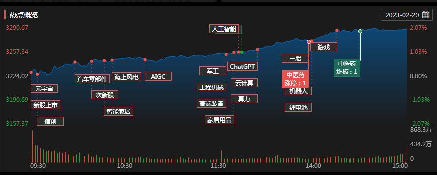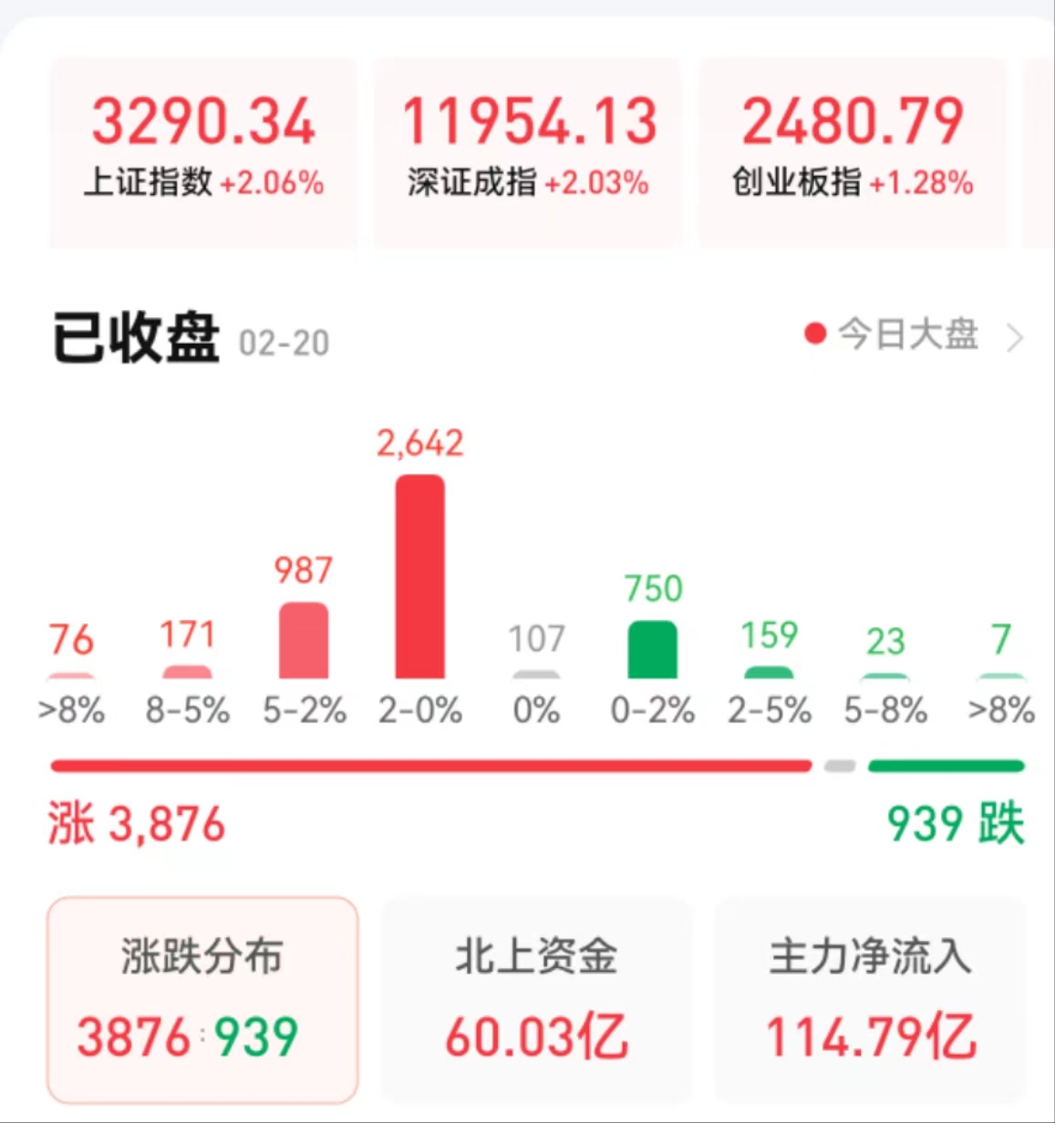 周一(2月20日),A股三大股指震蕩上行,全線飄紅。截至收盤,上證指數漲2.06%報3290.34點,深證成指漲2.03%報11954.13點,創(chuàng)業(yè)板指漲1.28%報2480.79點;兩市合計成交金額達9498億元,北向資金凈買入60.03億元,連續(xù)三個交易日凈買入??傮w上看,兩市個股漲多跌少。其中,漲停個股達41只,跌停個股達16只。