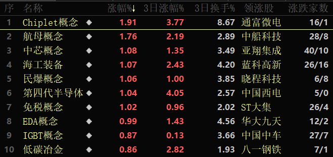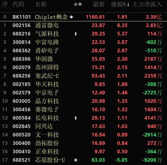 從早盤表現(xiàn)相對(duì)強(qiáng)勢的Chiplet概念板塊看,交易中的17只成分股中有16只上漲,其中,有2只個(gè)股漲幅超5%。資金方面,有2.39億元大單資金凈流入該板塊,居各概念板塊第16位。