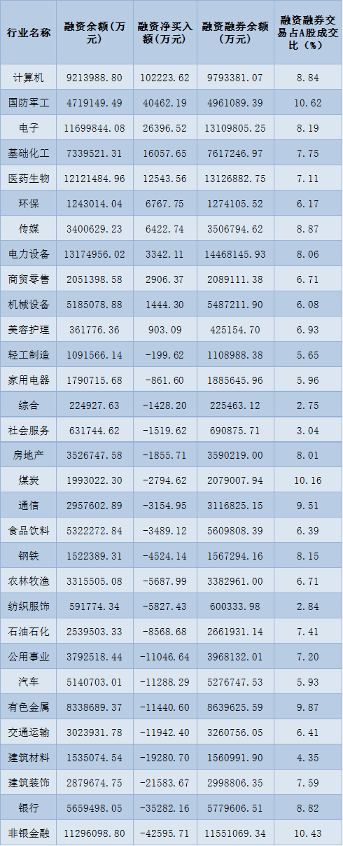 表:3月2日申萬一級(jí)行業(yè)兩融交易情況: