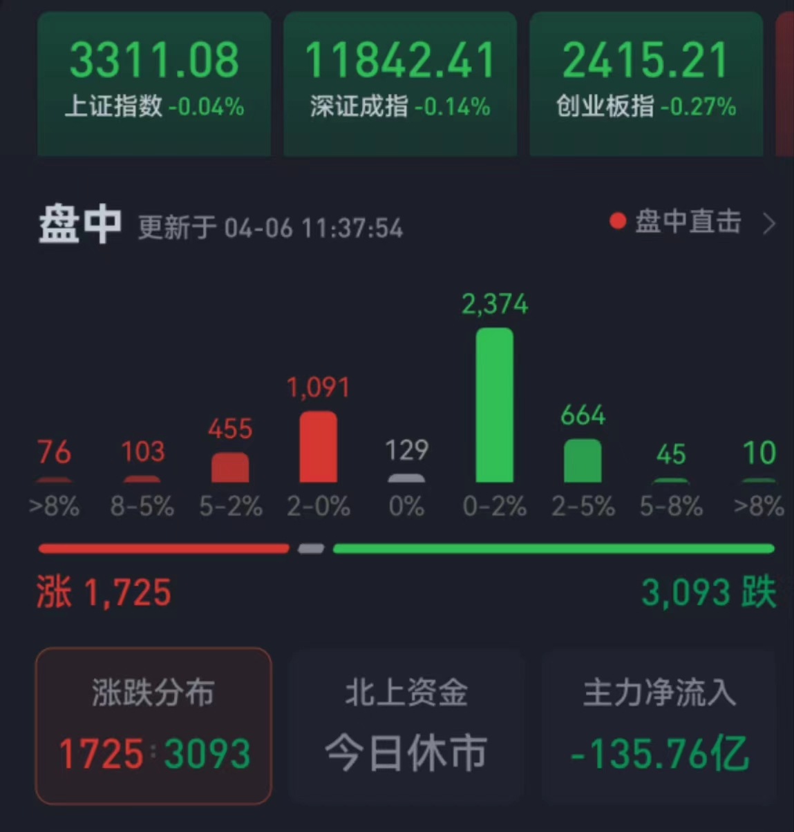 周四(4月6日),三大股指震蕩整理,略有回落。截至上午收盤,上證指數(shù)跌幅達0.04%,報3311.08點;深證成指和創(chuàng)業(yè)板指跌幅分別為0.14%和0.27%;滬深兩市合計成交額7257.9億元,總體來看,兩市個股跌多漲少。