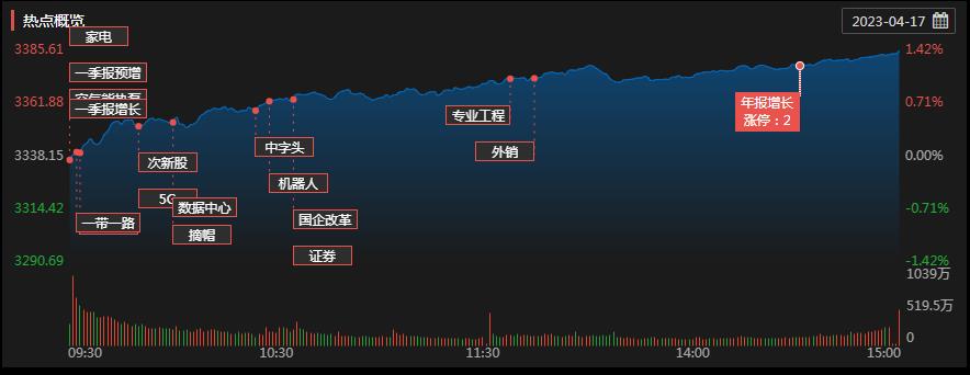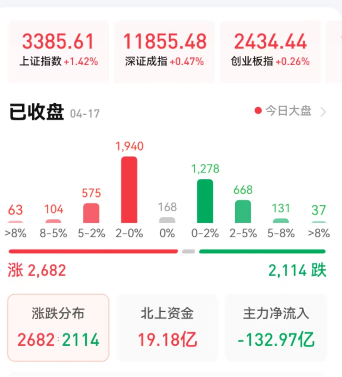周一(4月17日),A股三大股指震蕩上行,全線(xiàn)飄紅。截至收盤(pán),上證指數(shù)漲1.42%報(bào)3385.61點(diǎn),創(chuàng)出年內(nèi)新高;深證成指漲0.47%報(bào)11855.48點(diǎn),創(chuàng)業(yè)板指漲0.26%報(bào)2434.44點(diǎn),兩市合計(jì)成交11208.43億元,連續(xù)第10個(gè)交易日突破萬(wàn)億元;北向資金凈買(mǎi)入19.18億元??傮w上看,兩市個(gè)股漲多跌少。其中,漲停個(gè)股達(dá)38只,跌停個(gè)股達(dá)20只。