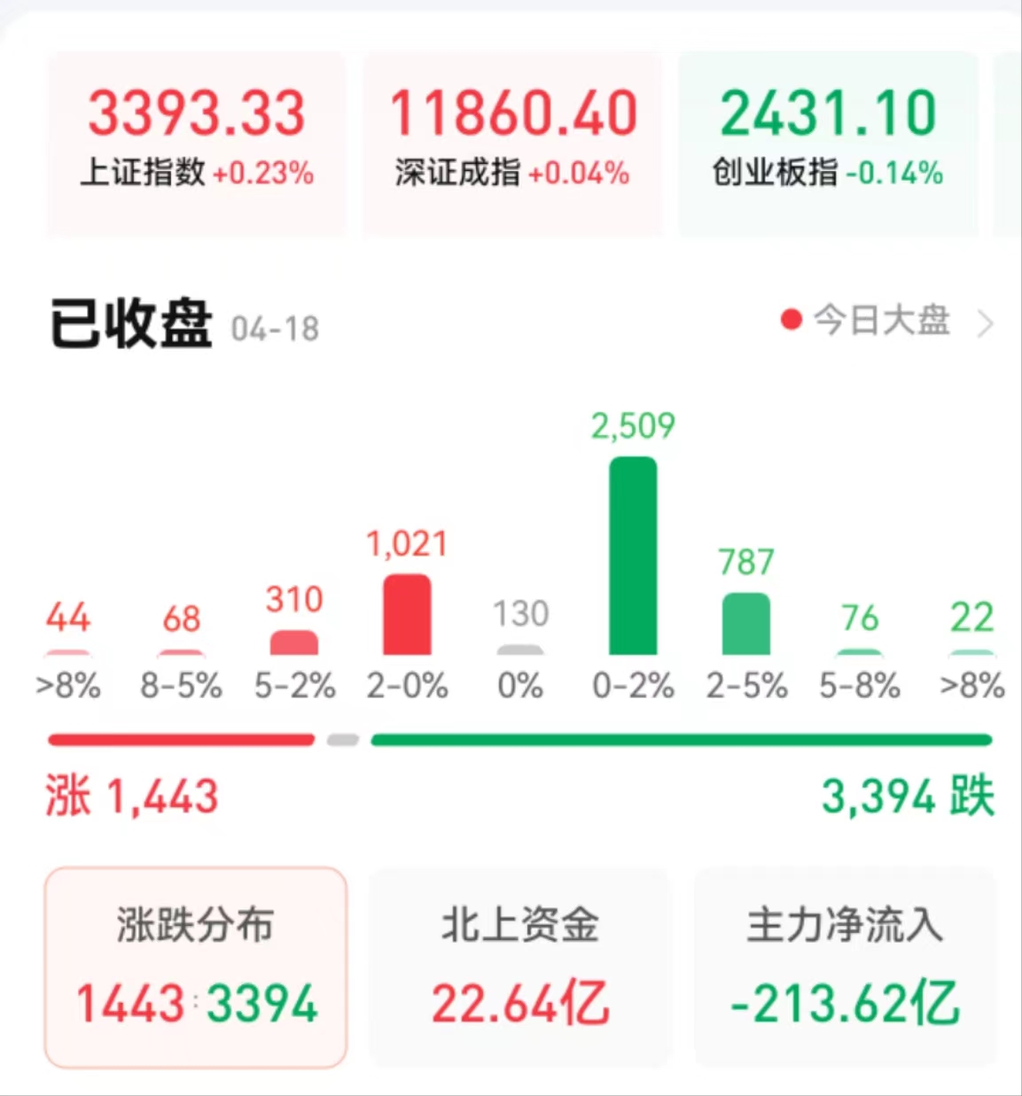 周二(4月18日),A股三大股指震蕩分化,漲跌不一。截至收盤,上證指數(shù)微漲0.23%報3393.33點,深證成指微漲0.04%報11860.4點,創(chuàng)業(yè)板指跌0.14%報2431.1點;滬深兩市合計成交額達10599.80億元,連續(xù)第11個交易日突破萬億元,北向資金凈買入22.64億元??傮w上看,兩市個股跌多漲少。其中,漲停個股達25只,跌停個股達15只。