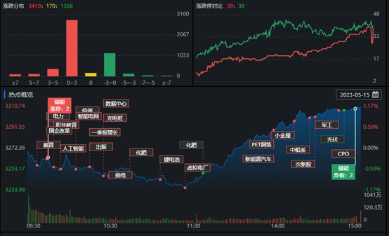 5月15日,截至收盤,上證指數(shù)漲1.17%報3310.74點,深證成指漲1.57%報11178.62點,創(chuàng)業(yè)板指漲2.11%報2299.93點;滬深兩市共成交9383億元。北向資金全天凈買入40.85億元,其中滬股通凈買入15.02億元,深股通凈買入25.83億元。今日A股中有3410只上漲,1366只下跌。