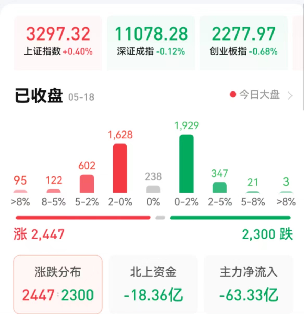 周四(5月18日),A股三大股指震蕩分化,漲跌不一。截至收盤,上證指數(shù)漲0.4%報3297.32點(diǎn),深證成指跌0.12%報11078.28點(diǎn),創(chuàng)業(yè)板指跌0.68%報2277.97點(diǎn),科創(chuàng)50指數(shù)漲0.5%;兩市合計成交8799億元,北向資金凈賣出18.36億元。總體上看,兩市個股漲多跌少。其中,漲停個股達(dá)49只,跌停個股達(dá)21只。