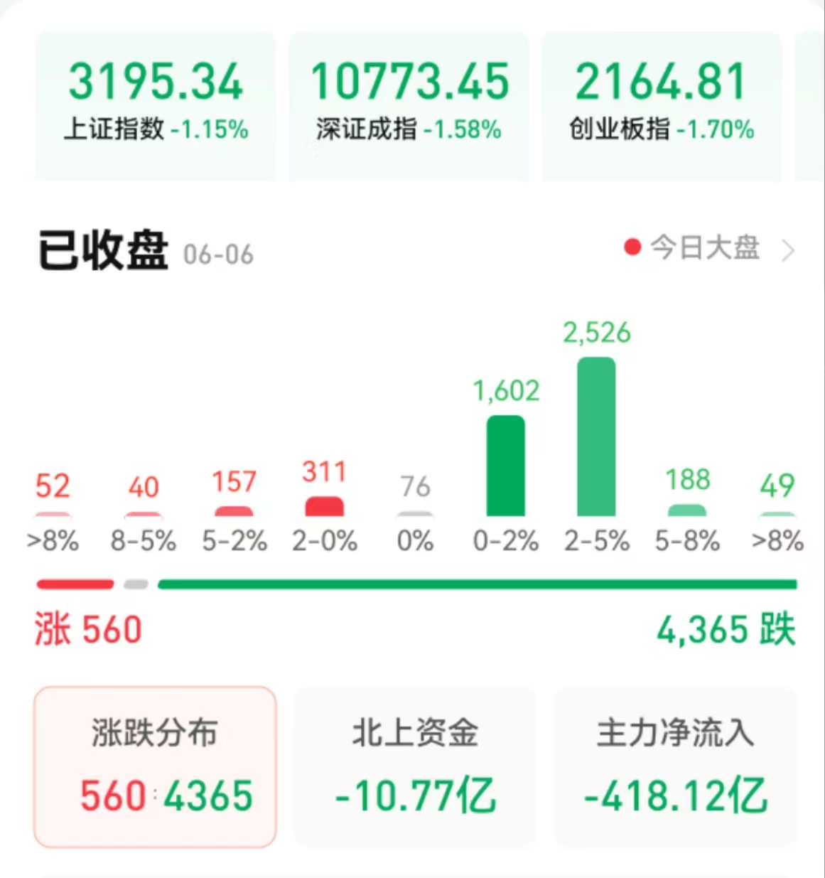 周二(6月6日),A股三大股指震蕩回落,全線下跌。截至收盤,上證指數(shù)跌1.15%報3195.34點,深證成指跌1.58%報10773.45點,創(chuàng)業(yè)板指跌1.70%報2164.81點;兩市合計成交9375億元,北向資金凈賣出10.77億元??傮w上看,兩市個股跌多漲少。其中,漲停個股達50只,跌停個股達19只。