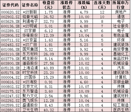 表:連續(xù)上漲4日且今日收盤漲停個股情況: