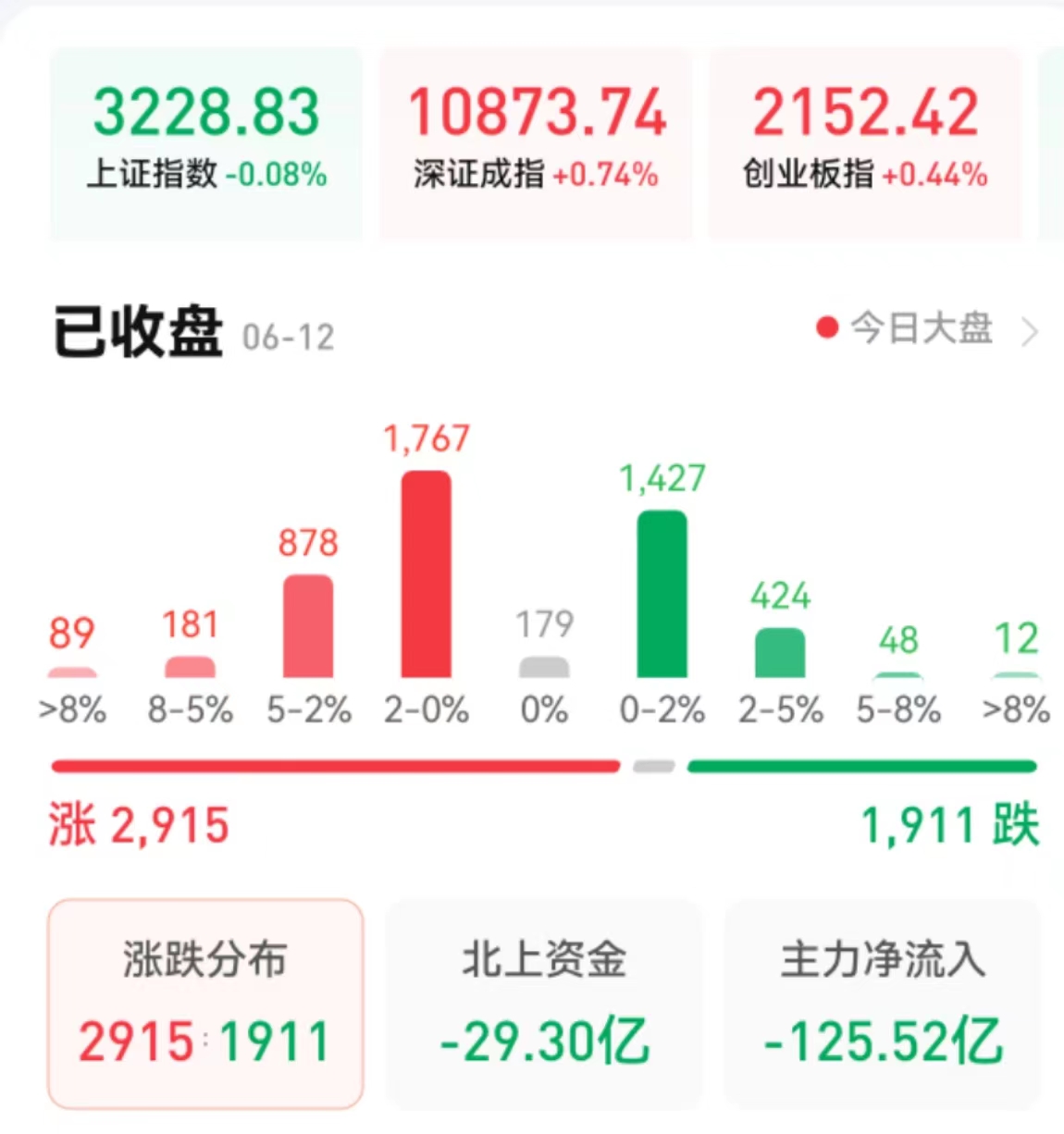周一(6月12日),A股三大股指震蕩分化,漲跌不一。截至收盤,上證指數(shù)跌0.08%報3228.83點(diǎn),深證成指漲0.74%報10873.74點(diǎn),創(chuàng)業(yè)板指漲0.44%報2152.42點(diǎn);兩市合計成交9654億元,北向資金凈賣出29.3億元。總體上看,兩市個股漲多跌少。其中,漲停個股達(dá)71只,跌停個股達(dá)13只。
