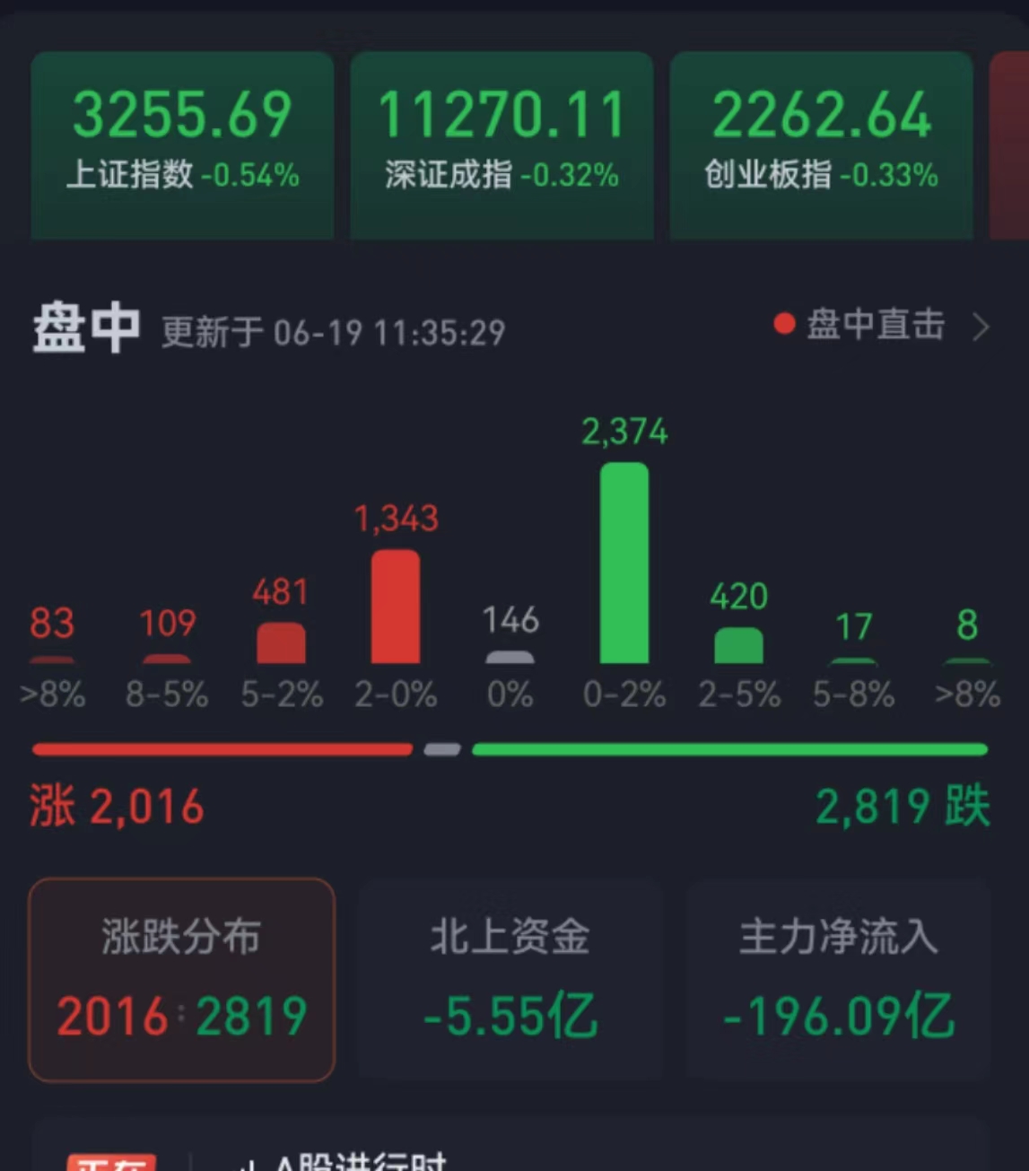 周一(6月19日),三大股指震蕩整理。截至上午收盤,上證指數(shù)跌0.54%,報(bào)3255.69點(diǎn);深證成指和創(chuàng)業(yè)板指分別跌0.32%和0.33%;滬深兩市合計(jì)成交額6989.4億元,總體來(lái)看,兩市個(gè)股跌多漲少。