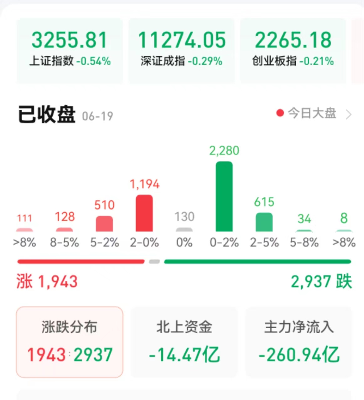 周一(6月19日),A股三大股指震蕩回落。截至收盤(pán),上證指數(shù)跌0.54%報(bào)3255.81點(diǎn),深證成指跌0.29%報(bào)11274.05點(diǎn),創(chuàng)業(yè)板指跌0.21%報(bào)2265.18點(diǎn),兩市合計(jì)成交金額達(dá)11067億元,連續(xù)第4個(gè)交易日突破萬(wàn)億元;北向資金凈賣出14.47億元??傮w上看,兩市個(gè)股跌多漲少。其中,漲停個(gè)股達(dá)54只,跌停個(gè)股達(dá)6只。