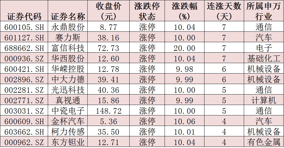 表:連續(xù)上漲4日且今日收盤(pán)漲停個(gè)股情況: