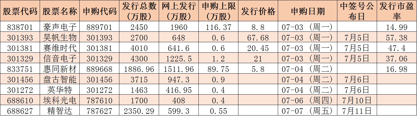 根據(jù)發(fā)行安排,下周(7月3日-7月7日)A股市場(chǎng)共9只新股發(fā)行,其中創(chuàng)業(yè)板5只,科創(chuàng)板2只,北交所2只。