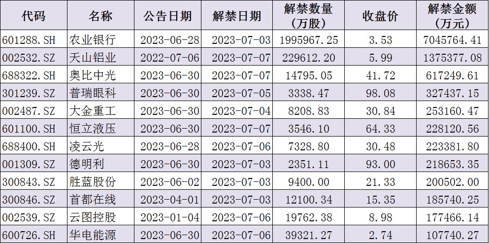 與此同時(shí),據(jù)同花順統(tǒng)計(jì)顯示,下周(7月3日-7日)共有88家公司限售股陸續(xù)解禁,按最新收盤(pán)價(jià)計(jì)算,解禁市值為1226.34億元。從解禁市值來(lái)看,農(nóng)業(yè)銀行(704.58億元)、天山鋁業(yè)(137.54億元)等公司解禁金額超100億元。