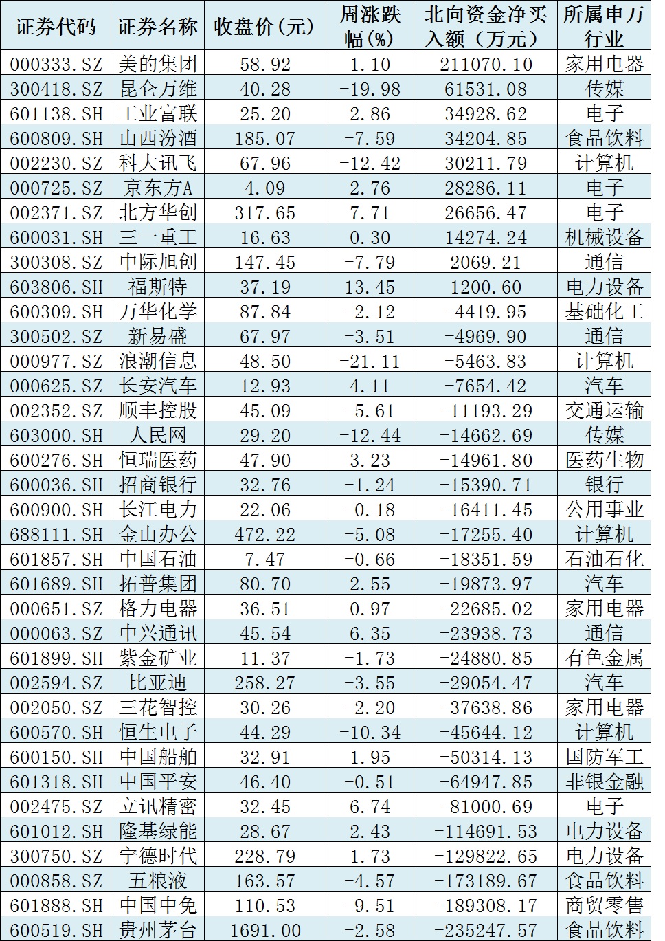 資金方面,本周北向資金累計(jì)凈賣出金額達(dá)84.81億元。從前十大成交活躍股來(lái)看,本周,美的集團(tuán)、昆侖萬(wàn)維等2只個(gè)股,北向資金凈買入金額均超6億元。另外,貴州茅臺(tái)、中國(guó)中免、五糧液、寧德時(shí)代、隆基綠能等個(gè)股遭北向資金凈賣出金額均超10億元。