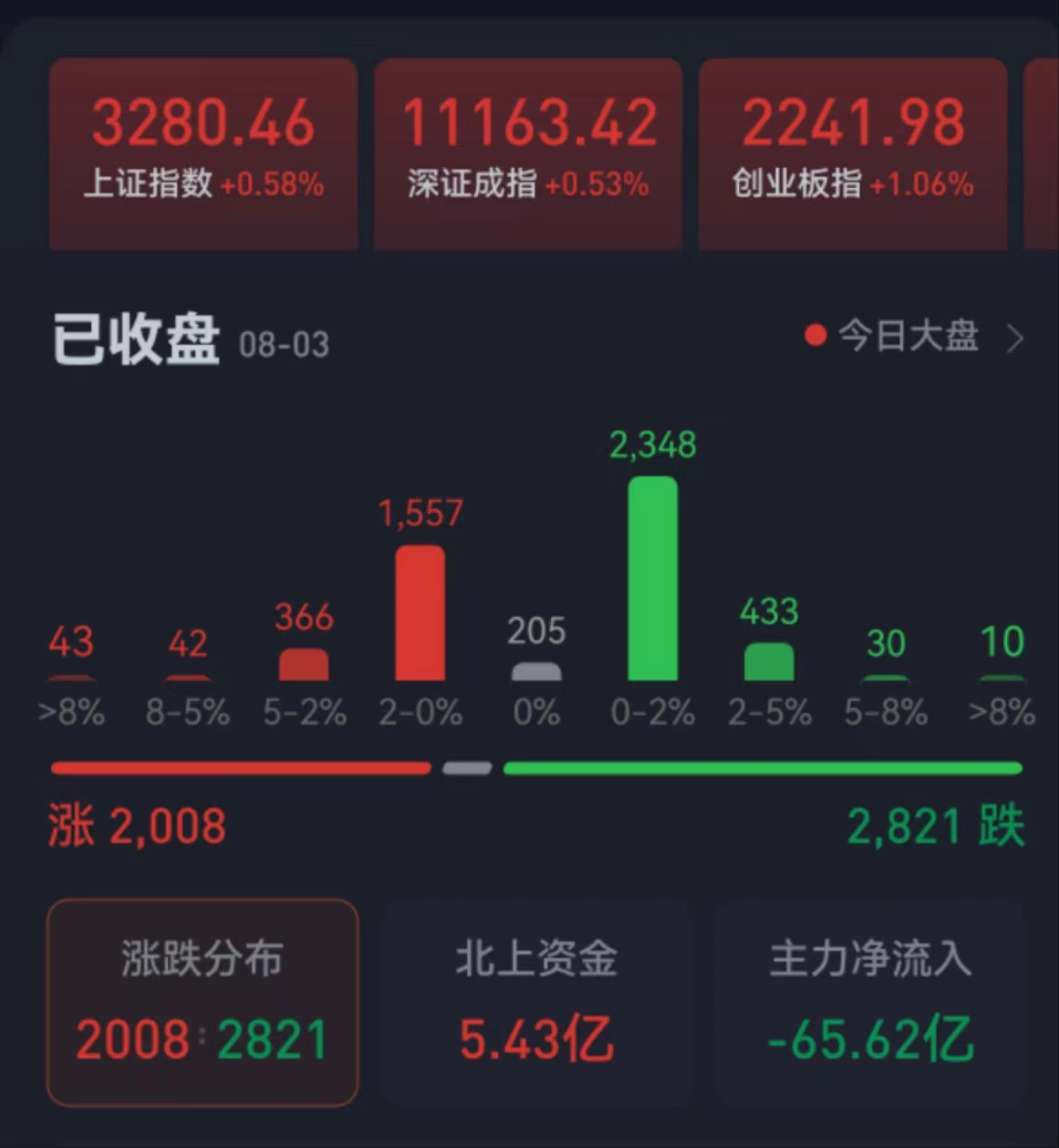 周四(8月3日),A股三大股指震蕩上行,全線飄紅。截至收盤,上證指數(shù)漲0.58%報(bào)3280.46點(diǎn),深證成指漲0.53%報(bào)11163.42點(diǎn),創(chuàng)業(yè)板指漲1.06%報(bào)2241.98點(diǎn);兩市合計(jì)成交8328.76億元,北向資金凈買入5.43億元??傮w上看,兩市個(gè)股跌多漲少。其中,漲停個(gè)股達(dá)27只,跌停個(gè)股達(dá)6只。
