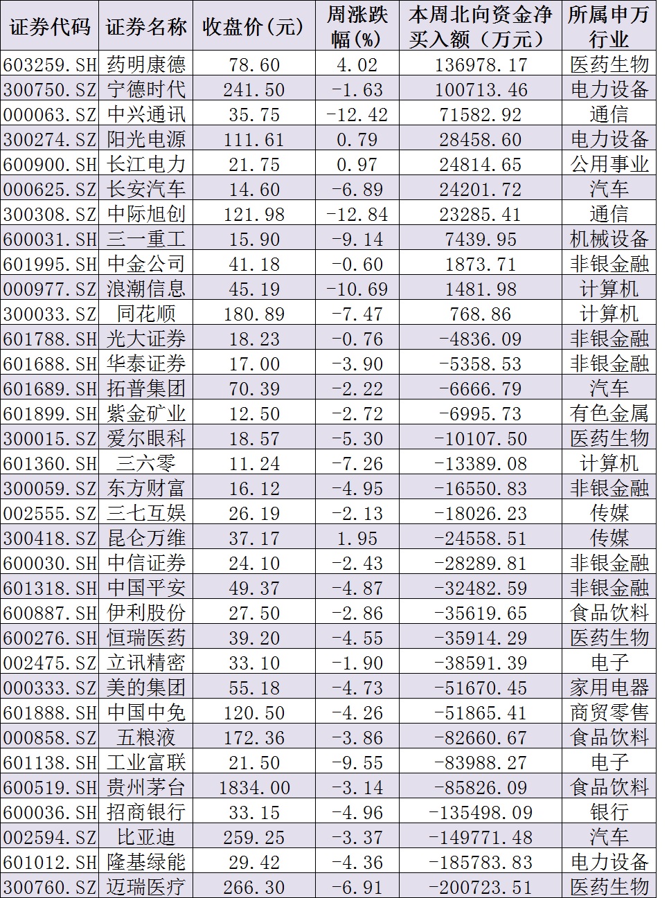 資金方面,本周北向資金累計凈賣出金額達255.8億元。從前十大成交活躍股來看,本周,藥明康德、寧德時代等2只個股,北向資金凈買入金額均超10億元。另外,邁瑞醫(yī)療、隆基綠能、比亞迪、招商銀行等個股遭北向資金凈賣出金額均超10億元。