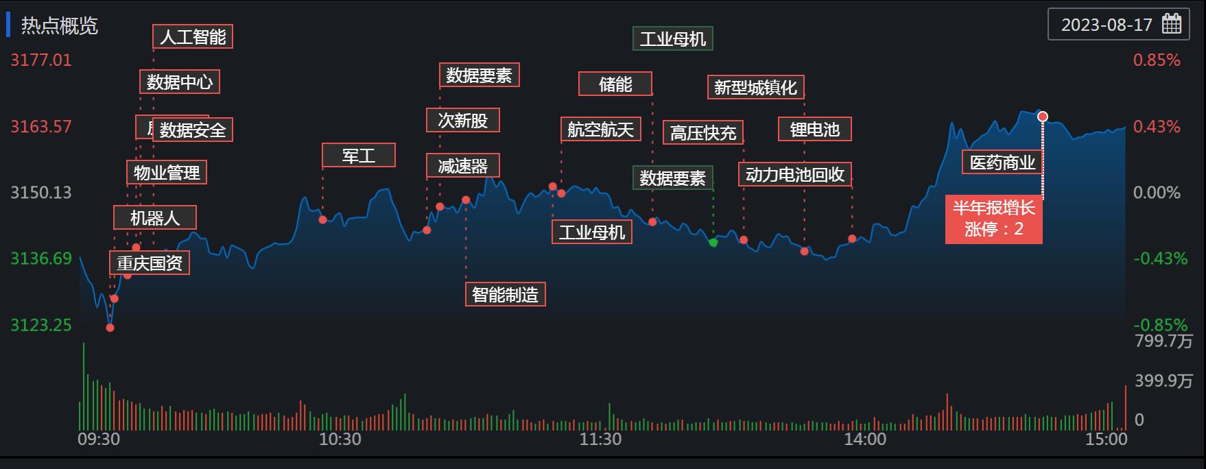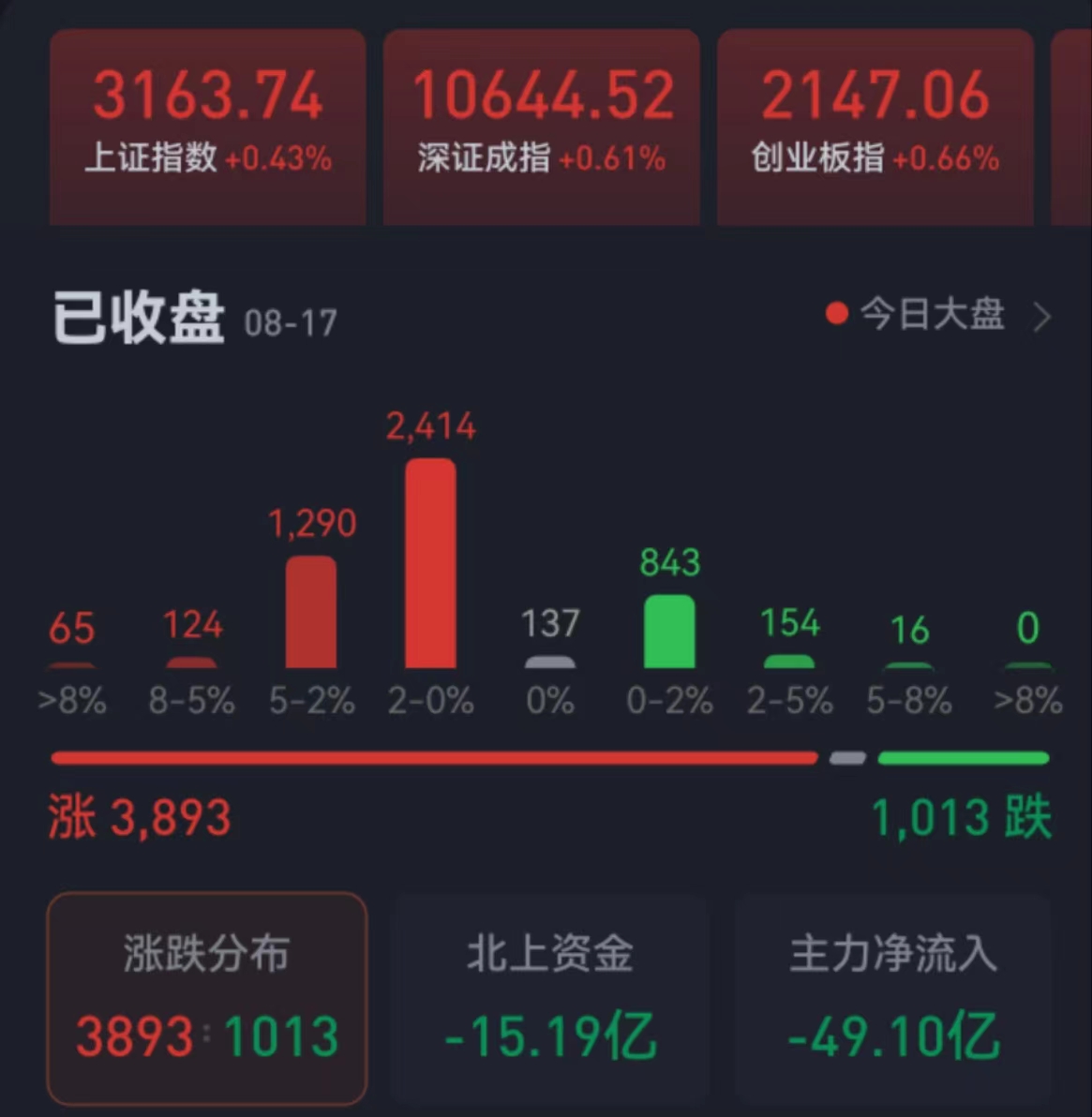 周四(8月17日),A股三大股指震蕩上行,全線飄紅。截至收盤,上證指數(shù)漲0.43%報3163.74點,深證成指漲0.61%報10644.52點,創(chuàng)業(yè)板指漲0.66%報2147.06點。兩市合計成交金額7398.19億元,北向資金凈賣出15.19億元。總體上看,兩市個股漲多跌少,近4000只個股上漲。其中,漲停個股達43只,跌停個股1只。