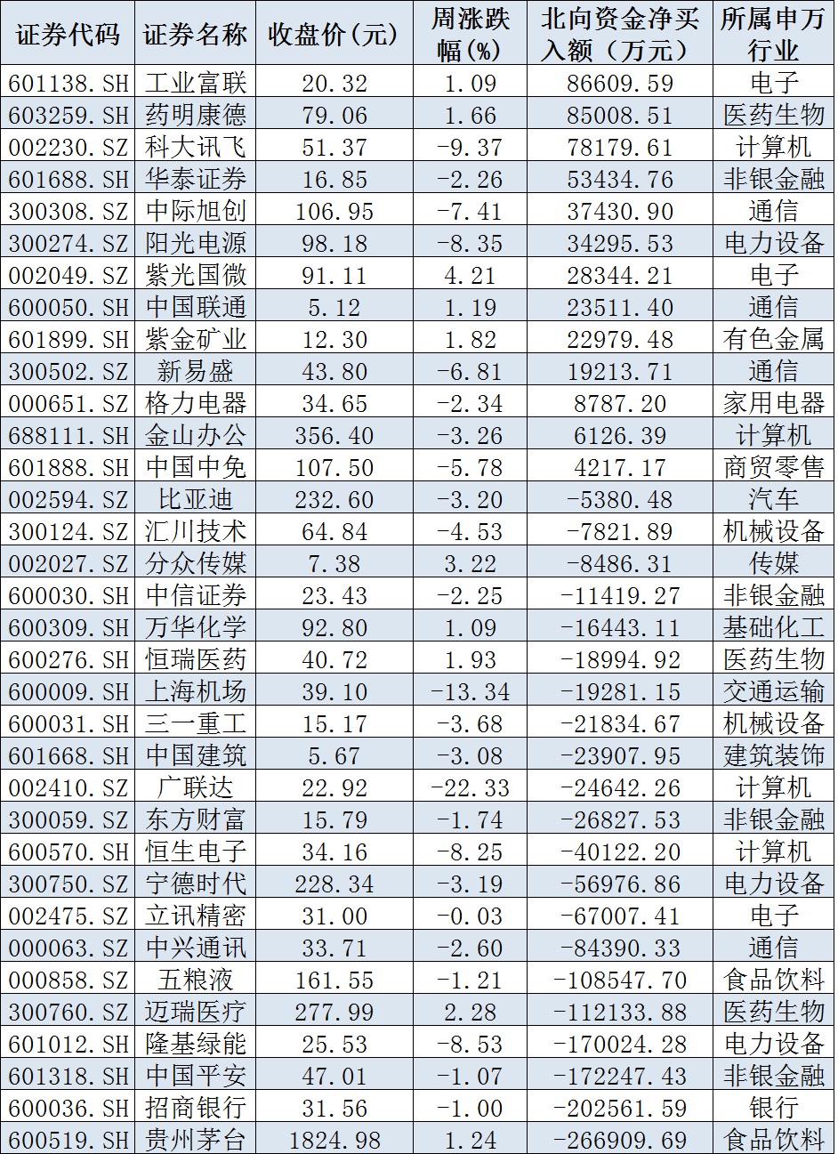 資金方面,本周北向資金累計凈賣出金額達(dá)224.20億元。從前十大成交活躍股來看,本周,工業(yè)富聯(lián)、藥明康德、科大訊飛等3只個股,北向資金凈買入金額均超7億元。另外,貴州茅臺、招商銀行、中國平安、隆基綠能等個股遭北向資金凈賣出金額均超17億元。