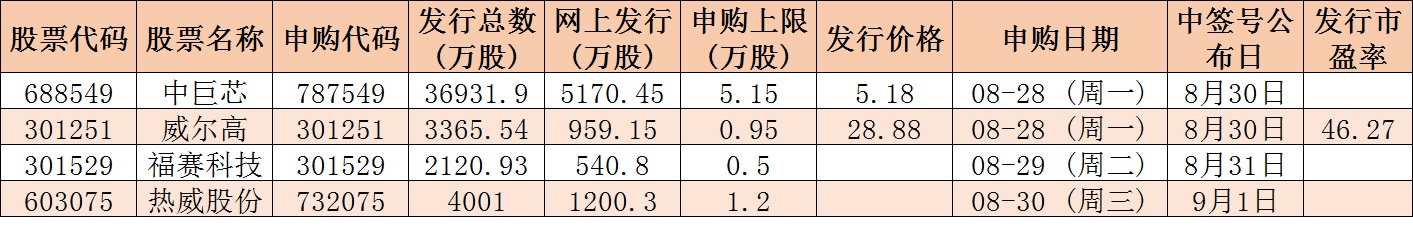 根據(jù)發(fā)行安排,下周(8月28日—9月1日)有4只新股發(fā)行,其中滬市主板1只,創(chuàng)業(yè)板2只,科創(chuàng)板1只。具體安排如下,周一2只:中巨芯(科創(chuàng)板)、威爾高(創(chuàng)業(yè)板);周二1只,福賽科技(創(chuàng)業(yè)板),周三1只:熱威股份,上述公司股票的申購將在下周陸續(xù)開放。