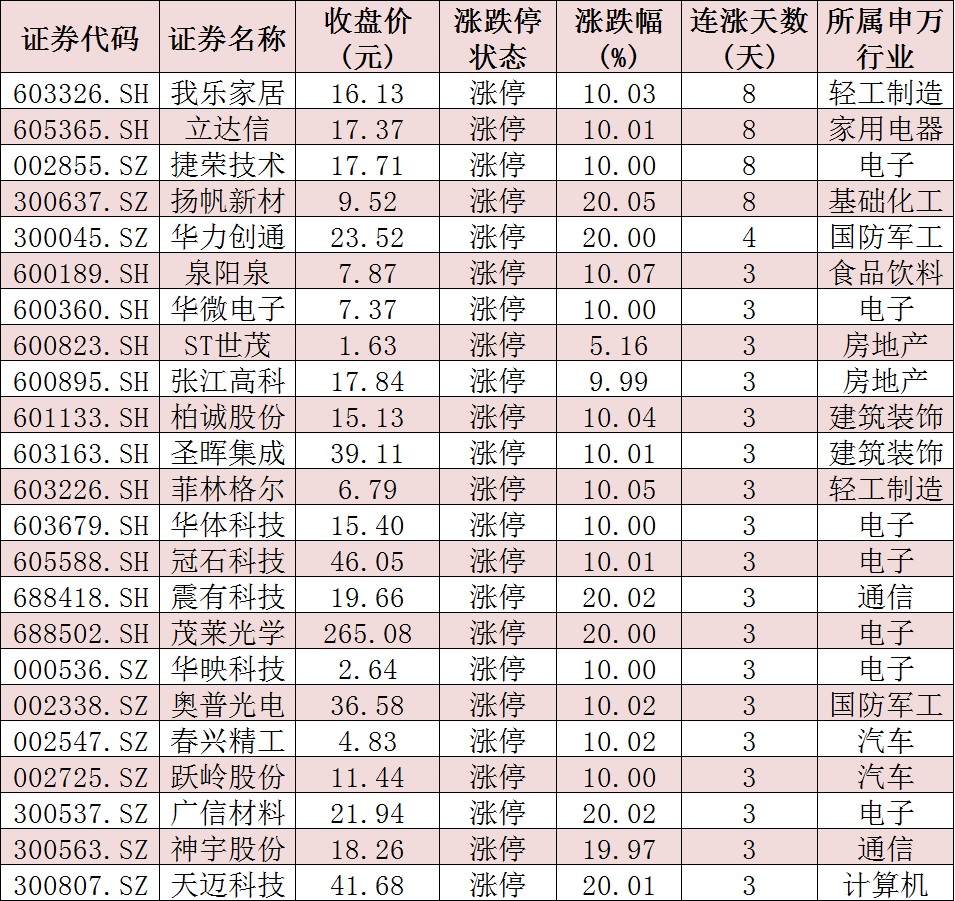 表:連續(xù)上漲3日且今日收盤漲停個(gè)股情況
