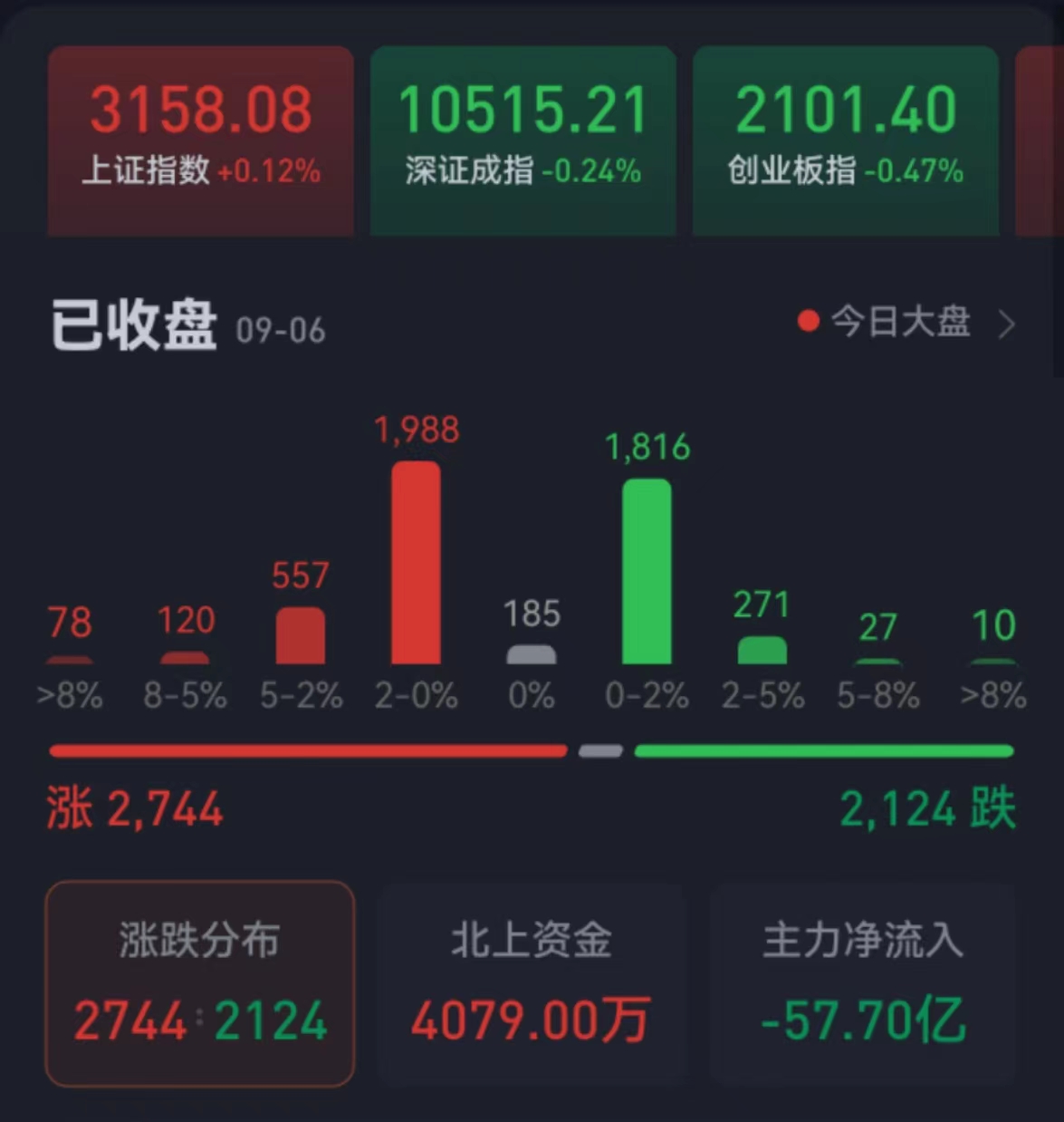 周三(9月6日),A股三大股指震蕩分化,漲跌不一。截至收盤,上證指數(shù)漲0.12%報(bào)3158.08點(diǎn),深證成指跌0.24%報(bào)10515.21點(diǎn),創(chuàng)業(yè)板指跌0.47%報(bào)2101.4點(diǎn);兩市合計(jì)成交金額達(dá)7712.08億元,北向資金凈買入4079萬元??傮w上看,兩市個(gè)股漲多跌少。其中,漲停個(gè)股達(dá)38只,跌停個(gè)股達(dá)5只。