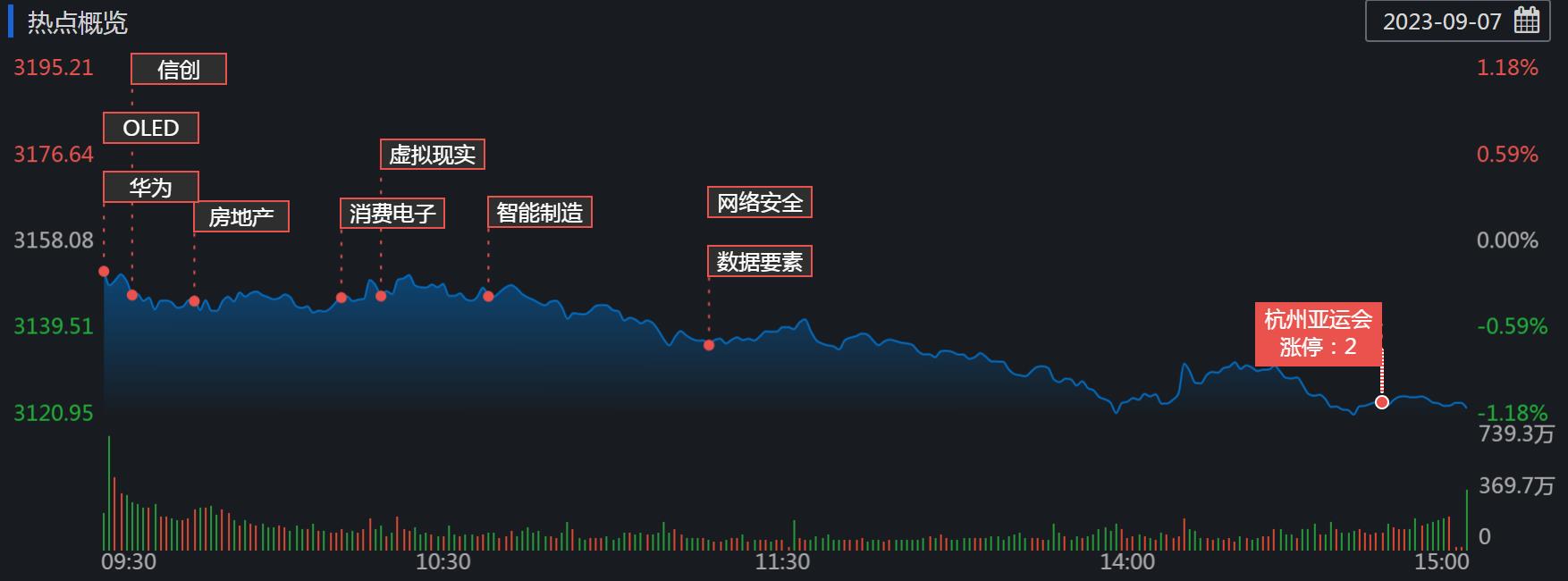 具體熱點看,今日酒店及餐飲板塊逆市領(lǐng)漲,君亭酒店、西安飲食漲超3%;教育板塊沖高回落,國脈科技、東方時尚漲超5%;電子競技開盤沖高后震蕩下行,華立科技20CM漲停;另有景點及旅游、華為鯤鵬、跨境支付板塊上漲。下跌方面國家大基金持股板塊領(lǐng)跌,光刻膠、BC電池、半導(dǎo)體及元件等近期活躍板塊跌幅居前。