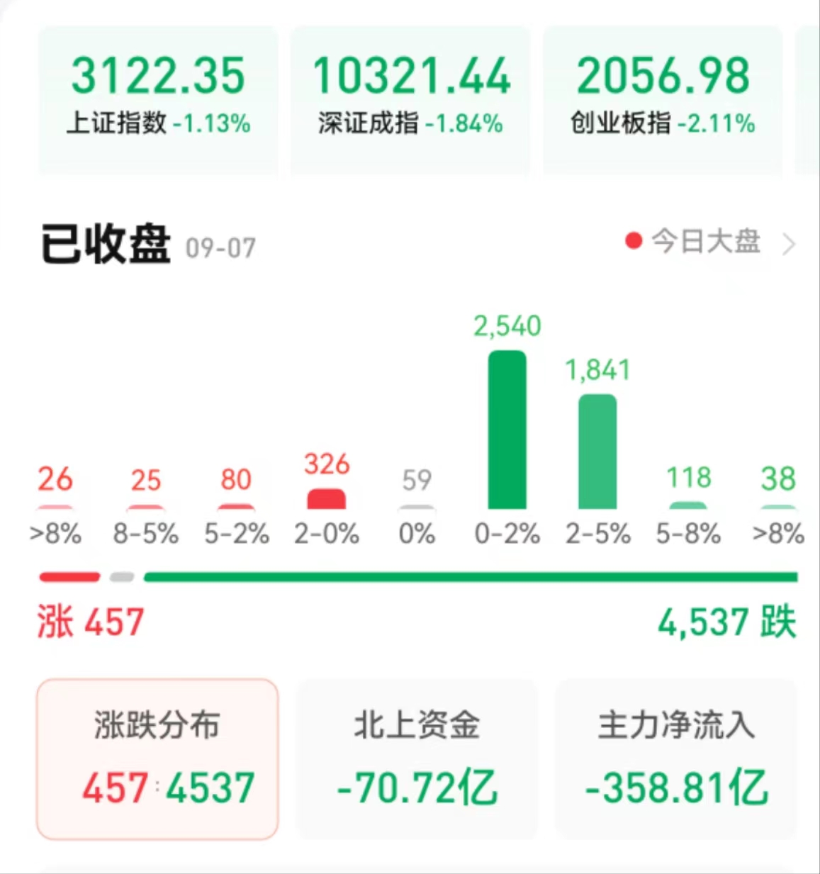 周四(9月7日),A股三大股指震蕩下行,全線飄綠。截至收盤,上證指數(shù)跌1.13%報3122.35點,深成指跌1.84%報10321.44點,創(chuàng)業(yè)板指跌2.11%報2056.98點;兩市合計成交7668.35億元,北向資金凈賣出70.72億元??傮w上看,兩市個股跌多漲少,超4500只個股下跌,上漲個股不到500只。其中,漲停個股達23只,跌停個股達4只。
