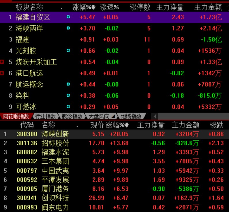 具體看,截至9月13日上午收盤,福建自貿(mào)區(qū)板塊強勢領(lǐng)漲,漲幅高達5.47%,海峽創(chuàng)新、福建水泥、三木集團等多只個股漲停。