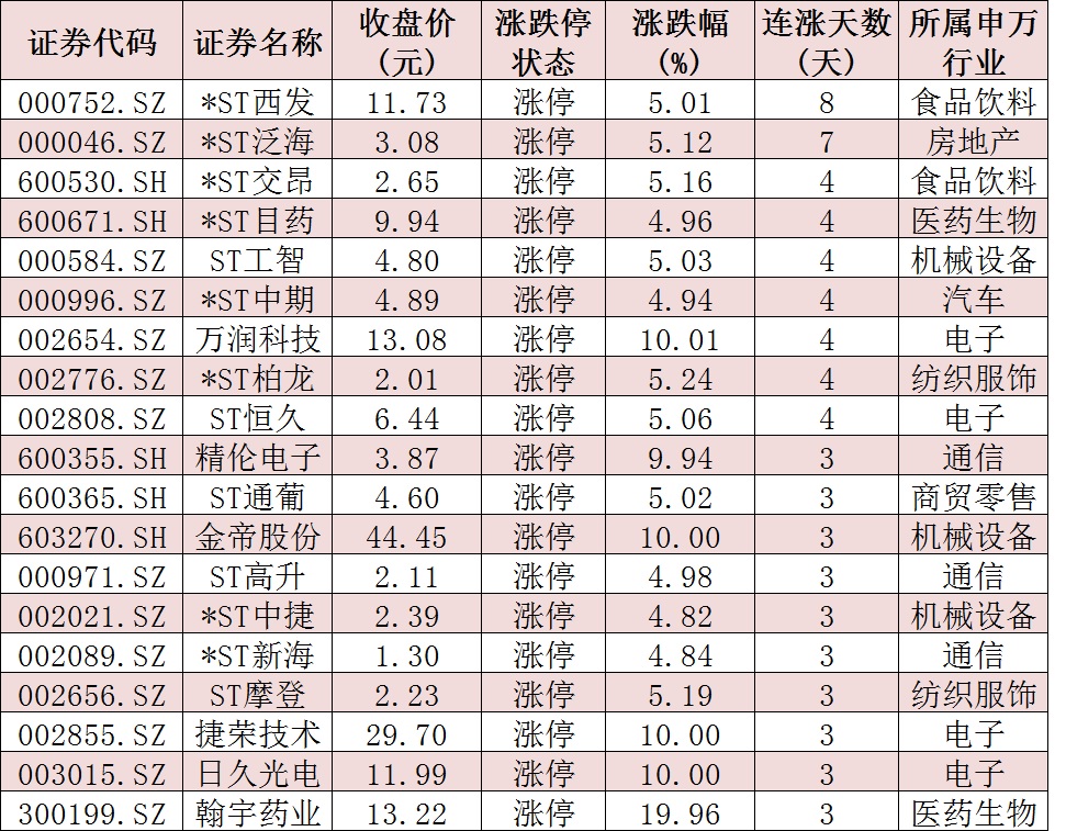 表:連續(xù)上漲3日且今日收盤漲停個(gè)股情況